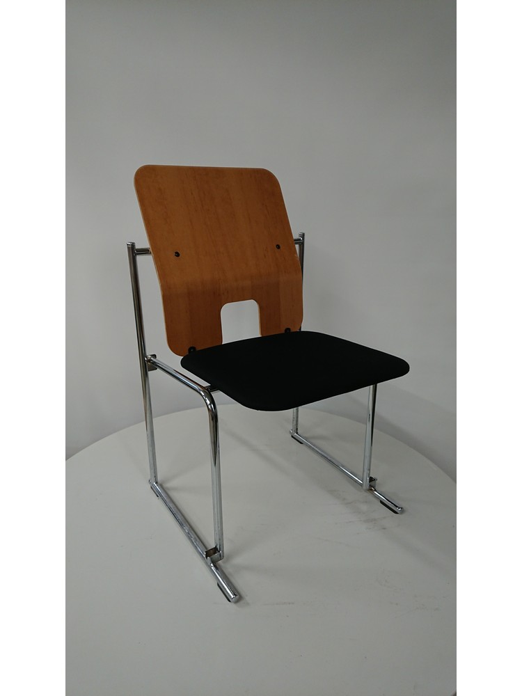 Musta kangasverhoilu, selkänoja vaneria, kromattu metallirunko.