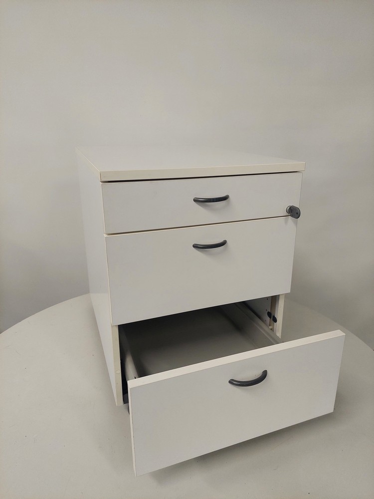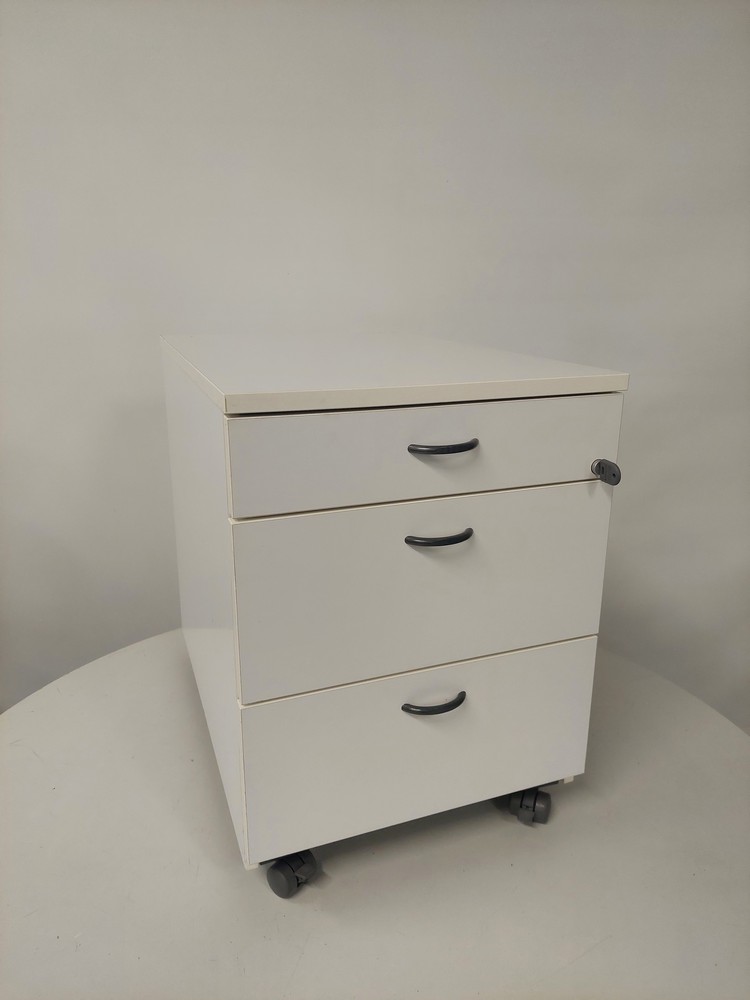 Valkoinen, 3-laatikkoa, lukittava.