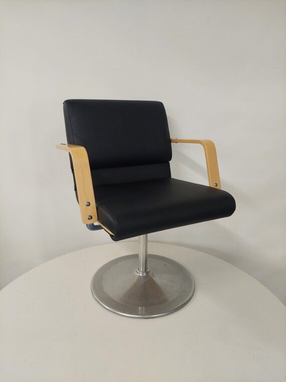 Ikoninen Plaano-nojatuoli 70-luvulta, musta kokonahkaverhoilu.