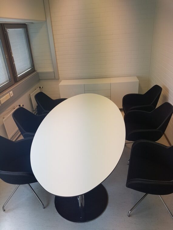 Ovaalinmallinen valkoinen neuvottelupöytä ja tuolit 6 kpl