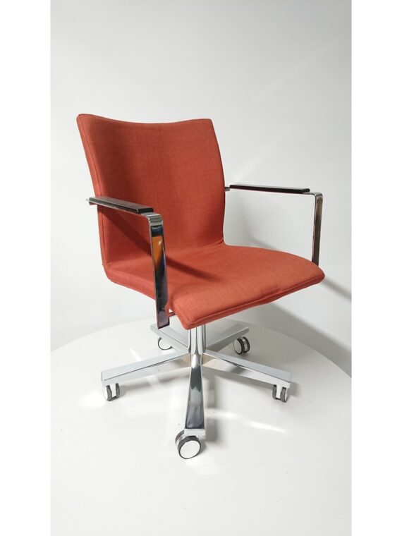 Käsinojallinen neuvottelutuoli pyörillä, oranssi-ruskea kangasverhoilu.