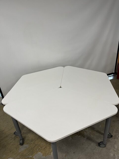 Käytetty pyörillä liikuteltava monikäyttöinen 3-osainen pöytä. Soveltuu käyttötarkoituksiin kuten neuvottelutilaan tai coworking-tilaan.