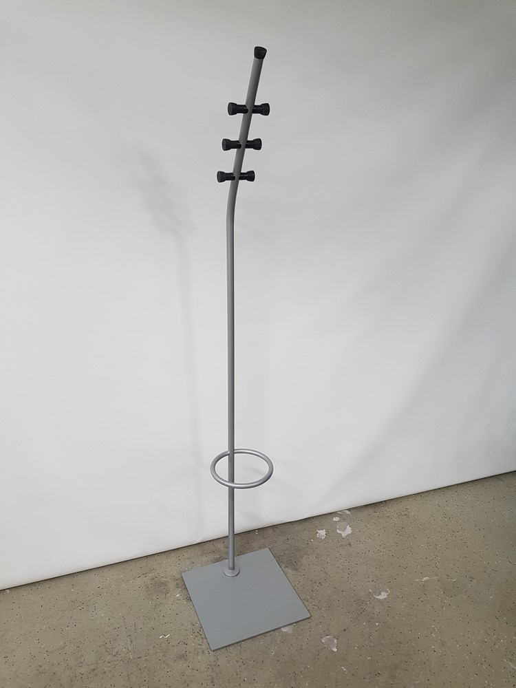 Kuusi koukkua takeille sekä sateenvarjoteline.