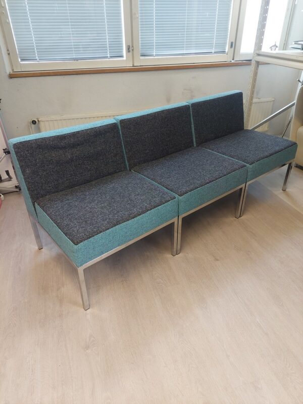 Muunneltava Cube-mallisto on omiaan kun tarvitaan edustava kokonaisuus joka mukautuu vaihtuviin käyttötarpeisiin. Moduuleita voi liittää yhteen tai käyttää erikseen tuoleina. Väri: Tummanharmaa/turkoosi(meleerattu) villakangasverhoilu, kromattu metallirunko. Suunnittelija: Mikko Halonen. Koko: 195 x 65, korkeus 44/75 cm. Mitat/moduuli: 65 x 65 cm, istuinkorkeus 44 cm, kokonaiskorkeus 75 cm. Paketti sisältää irrotettavat Cube sohvamoduulit 3 kpl.590,00€ sis. alvLisää koriin