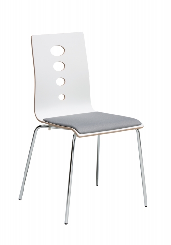 Ilmavan oloinen, moderni taivutetuoli, istuinverhoilulla tai ilman. Varastovärit: – runko kromi – valkoinen W1000 laminaatti-istuin + istuinverhoilu YB094 harmaa – musta laminaatti -istuin -tummanharmaa laminaatti-istuin -tuolin leveys 50 cm -pinottava