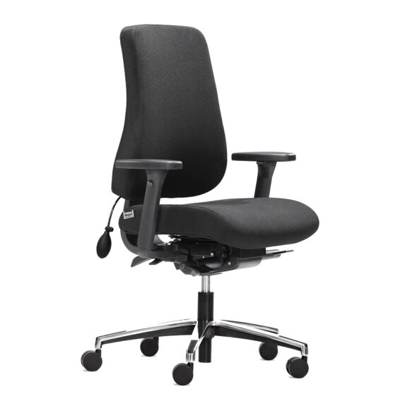 Työtuolissa on istuimen korkeuden-, syvyyden- sekä kallistuksensäätö, myös istuimen negatiivisen kulman säätö. Siinä on painon mukaan säädettävä keinuvastus ja syncro-mekanismi, jolloin istuin ja selkänoja liikkuvat automaattisesti suhteessa toisiinsa. Helppo selkänojan korkeudensäätö toimii istuessasi tuolissa, nostat vain selkänoja haluamaasi korkeuteen. Työtuolissa on vakiona ilmatäytteinen ristiseläntuki.  4d -käsinojissa on leveyden- ja korkeuden säätö. Käsinojien yläosa kääntyy 360° ja liukuu eteen- ja taaksepäin. Gabrielin Fighter -kangasverhoilu, kankaan hankauskesto on 130 000 Martindale, verhoiluvärit: musta.