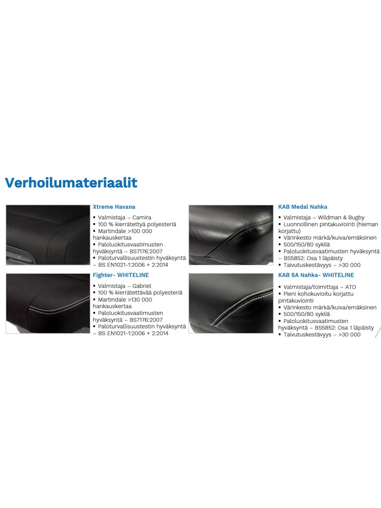 | Valitse: | 308293 HAVANA Xtreme Camira, kangas/musta., 308294 KAB Medal nahka, musta. |